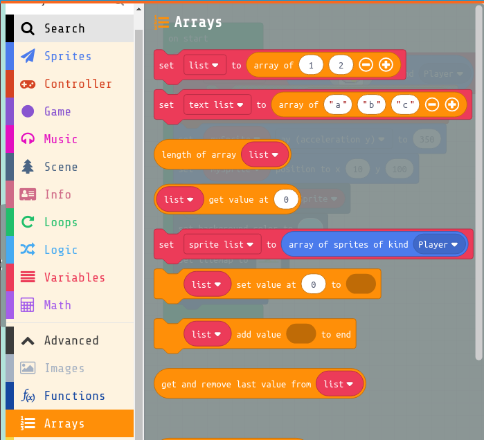 From Advanced > Arrays drag in a set list to array of block to the end of the on start block above the call createLevels block.